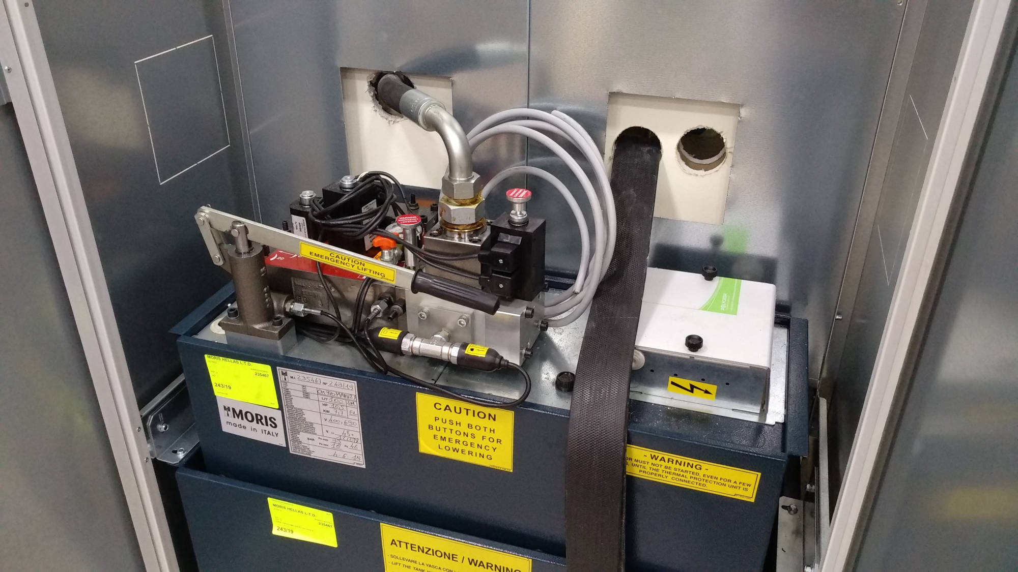 Η πρώτη φάση του project αφορούσε στην τοποθέτηση μηχανολογικού εξοπλισμού (οδηγοί, έμβολο και πλαίσιο ανελκυστήρα), κασωμάτων αυτόματων θυρών καθώς και στην τοποθέτηση της αντλίας και του πίνακα.